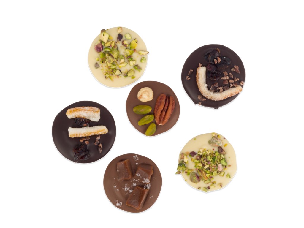 Čokoládová kolečka z hořké, mléčné a bílé čokolády.