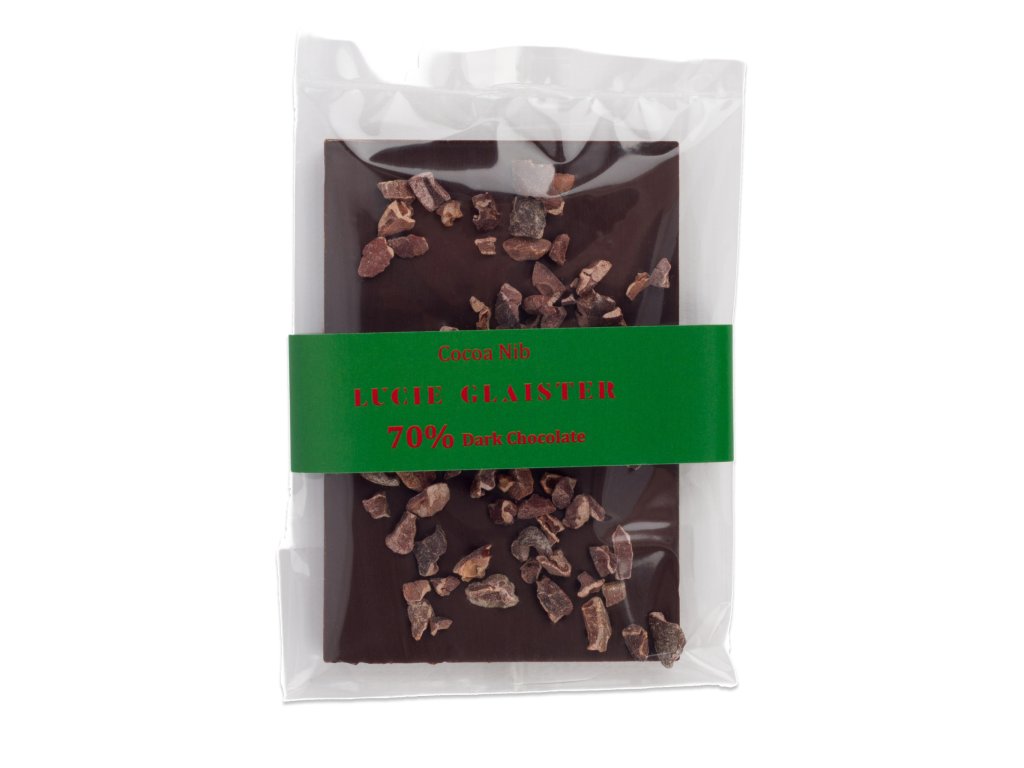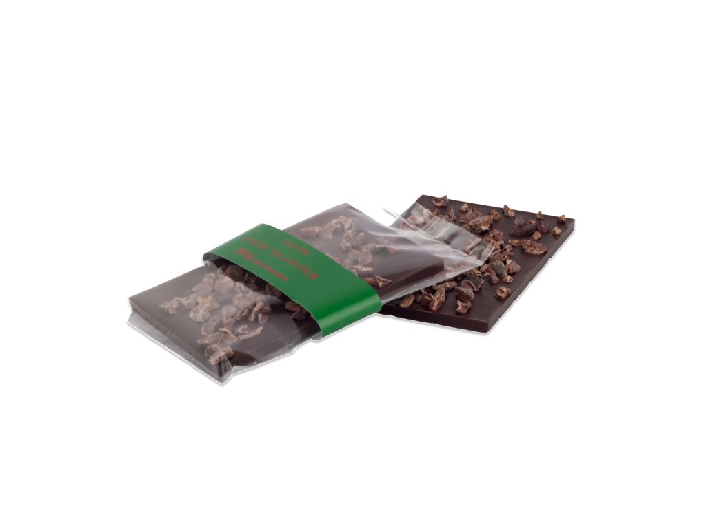 Složení: kakaová hmota 70,3%, kakaové máslo, cukr, drcený kakaový bob, emulgátor: sójový lecitin, aroma: přírodní vanilka