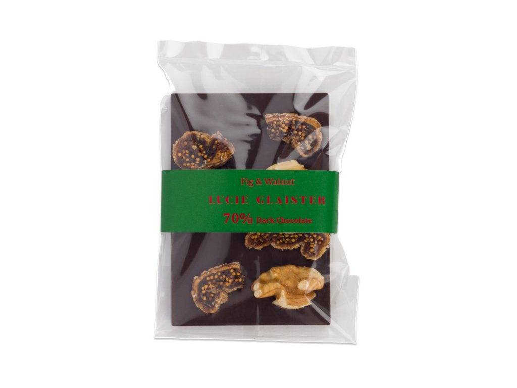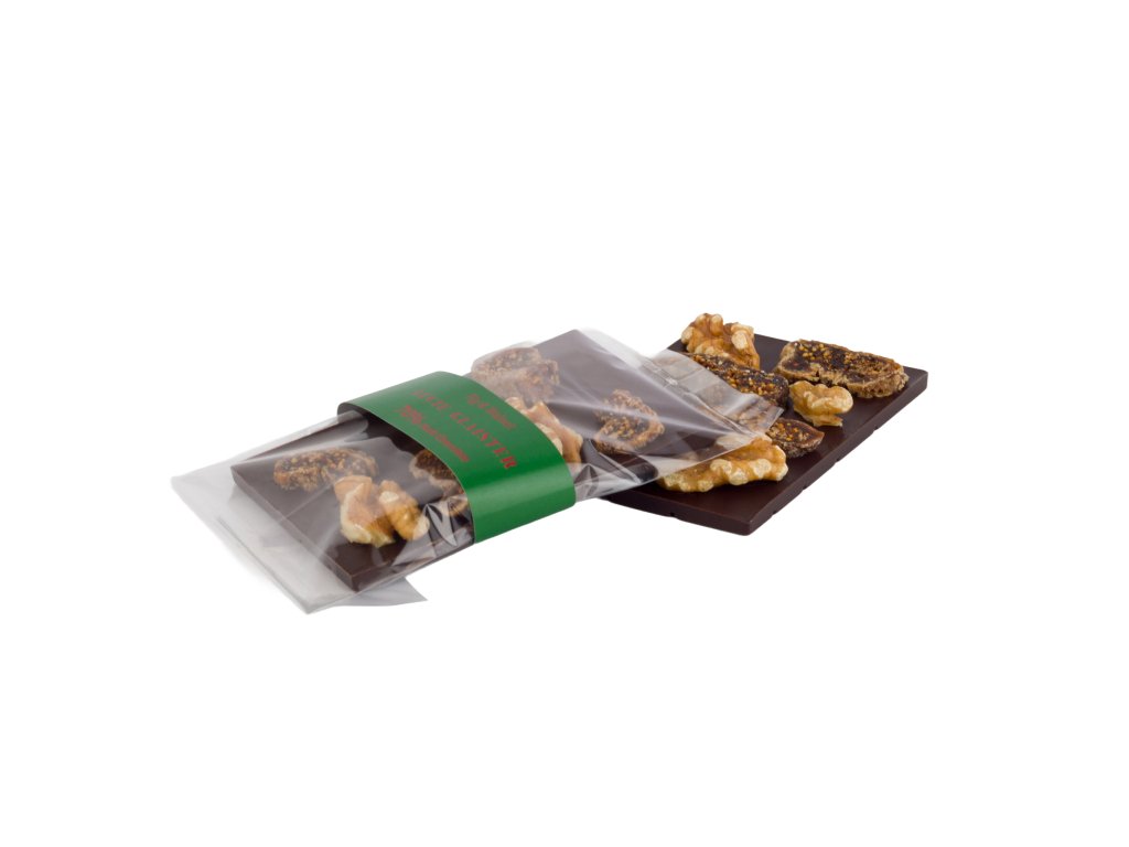 Složení: kakaová hmota 70,3%, kakaové máslo, cukr, sušené fíky, vlašské ořechy emulgátor: sójový lecitin, aroma: přírodní vanilka