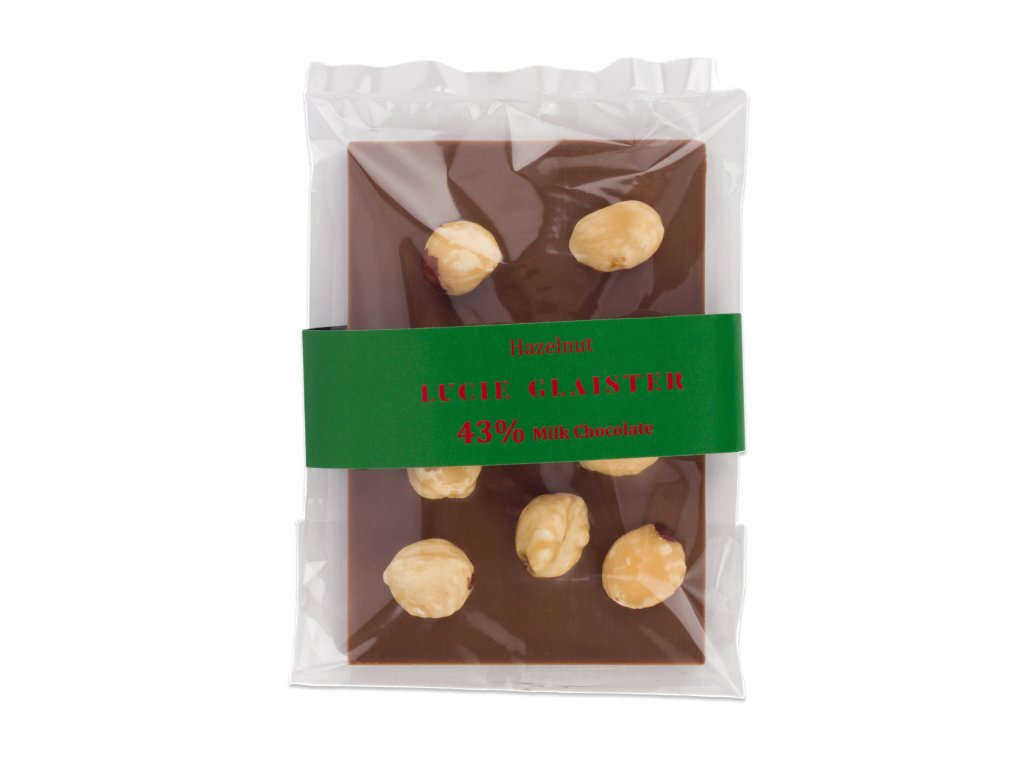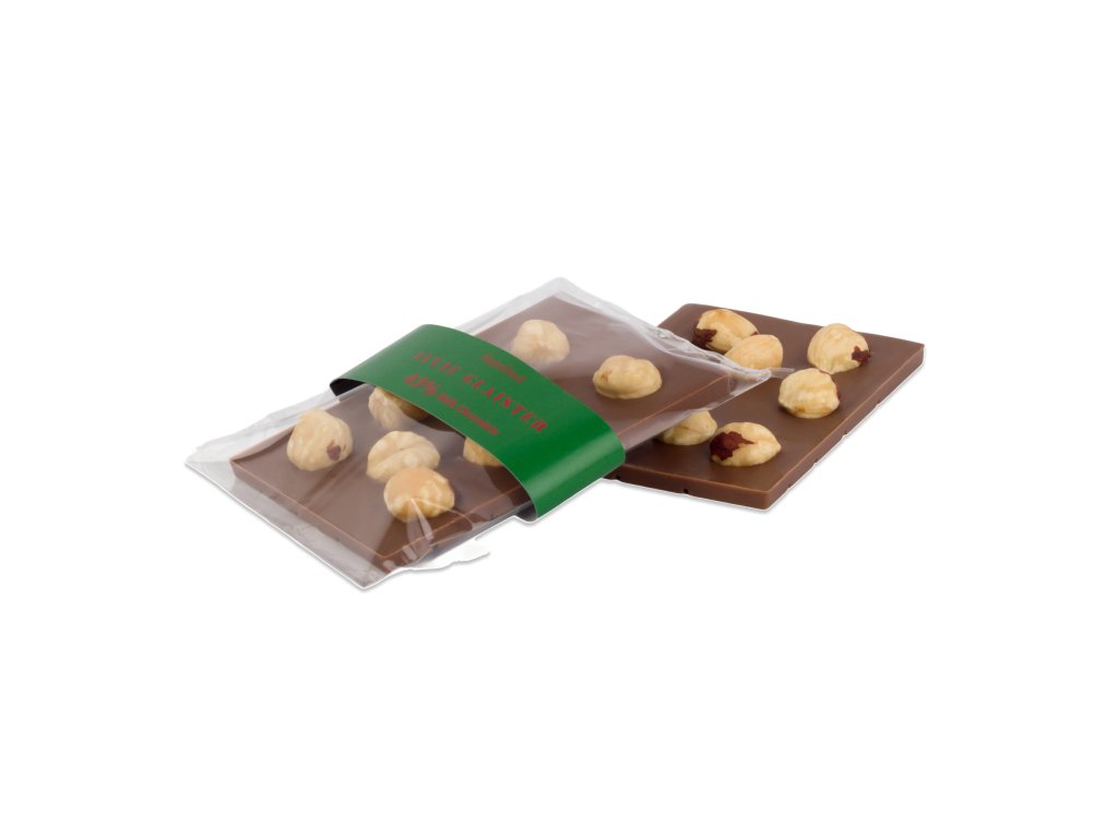 Složení: kakaová hmota 43%, kakaové máslo, sušené mléko, lískové ořechy, cukr, emulgátor sójový lecitin, aroma: přírodní vanilka
